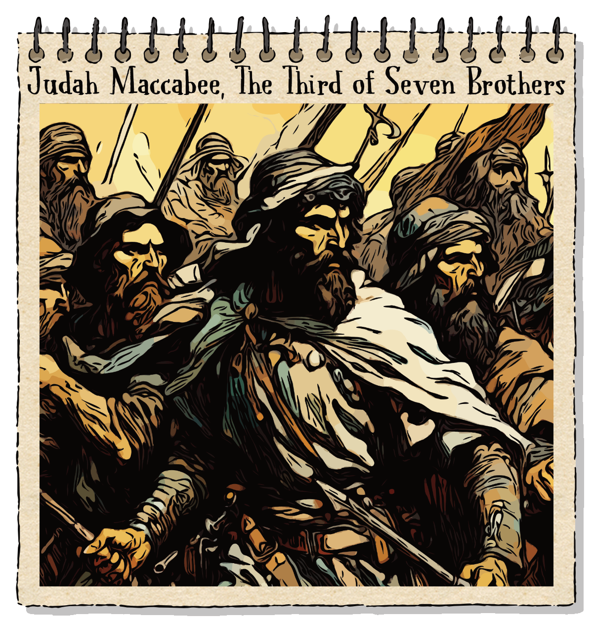 Judah was one of seven sons of Mattathias who died in 166 BCE. His dying request was for Judah to take command of the warriors of the revolt. The name Maccabee is thought to be an acronym made from key Hebrew letters found in “Who among the gods is like you, O Adonai?” The letters may form a word meaning “hammer.”