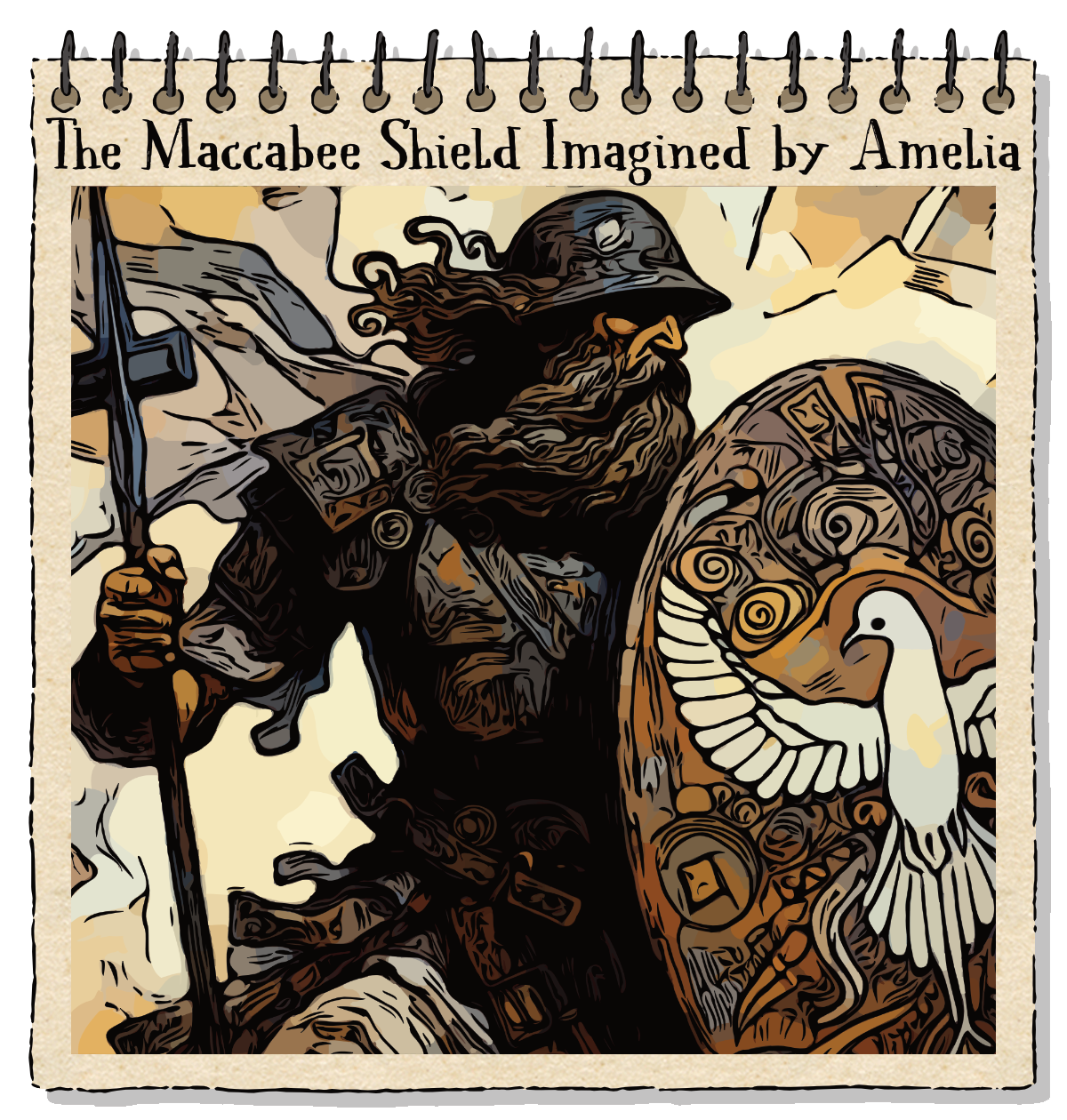Amelia felt that if The Maccabees were going to have armor, they likely would need a shield for protection to go with it that was decorated with symbols that held strong meaning. She used a hammer to represent their strength and resilience, and a dove to represent their enduring spirit and quest for peace.